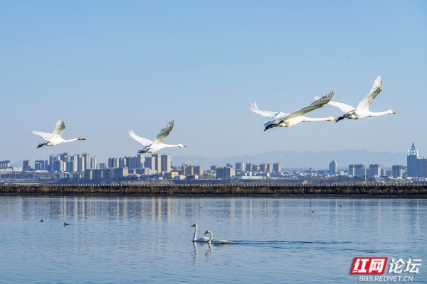 它们时而舒展双翼,在水面划出优美的弧线;时而腾空而起,与远处的城市楼群和连绵山峦构成一幅灵动的画卷。岸边,人们驻足观赏,用镜头定格这人与自然和谐共生的美好瞬间。