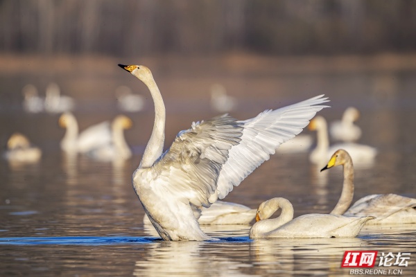 近日,河南省三门峡市天鹅湖国家城市湿地公园成了白色精灵的王国。清澈的水面上,成群的大天鹅或悠然游弋,或引吭高歌,洁白的羽毛在阳光下熠熠生辉。