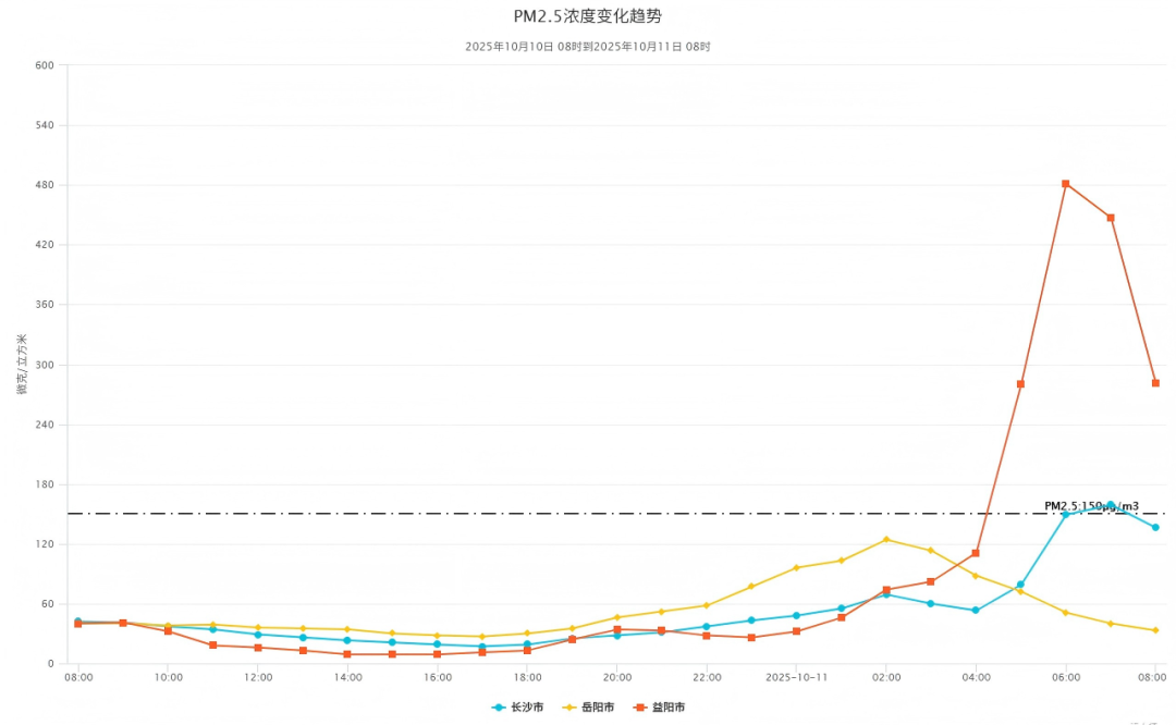 长沙空气质量从今天5时起达轻度污染,7时达到重度污染,截至12时已降至轻度污染。经分析,本次污染过程主要是受湘北及湖南湖北交界处露天焚烧秸秆影响,污染气团随偏北气流向南迁移并在长沙聚集。加之凌晨低空有逆温层,导致污染加剧。长沙市11日5时轻度污染,7时重度污染,与上下游城市呈明显时序关联特征。组分监测表明,长沙市的颗粒物组分增长符合生物质(秸秆)燃烧特征。