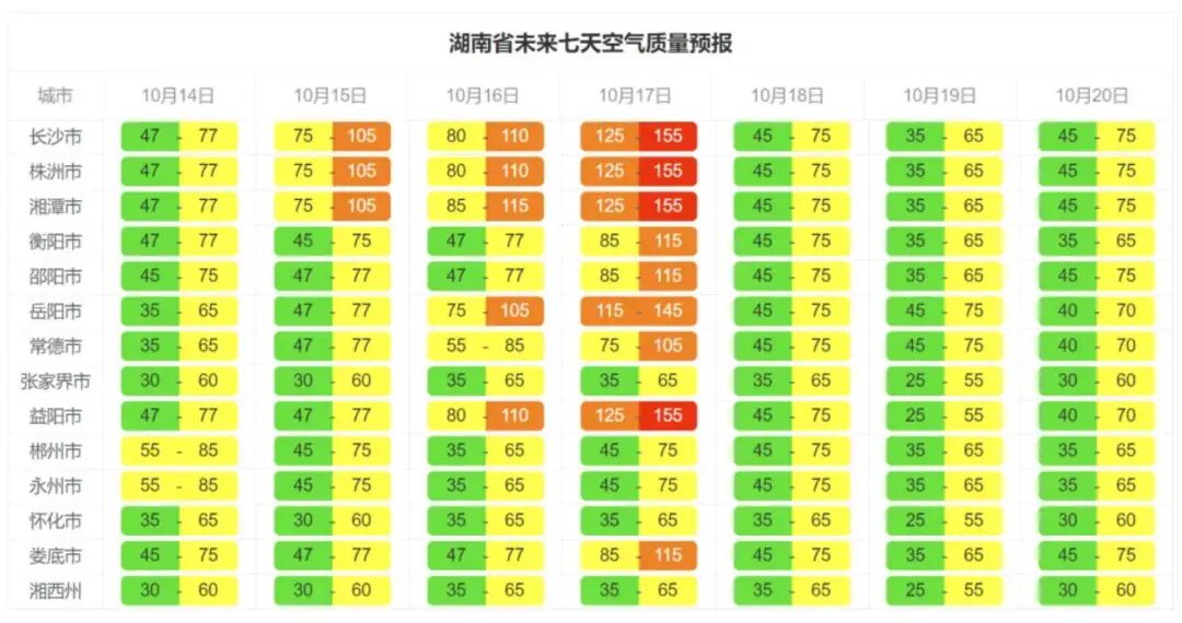 未来7天空气质量预报具体如下:10月15日,温度有所回升,湘西、湘南多云转阴天,部分地区有阵雨或雷阵雨,其他地区多云间晴天,环洞庭湖区域以及长株潭地区有秸秆焚烧风险,湘中、湘北良至轻度污染,其余地区优至良;