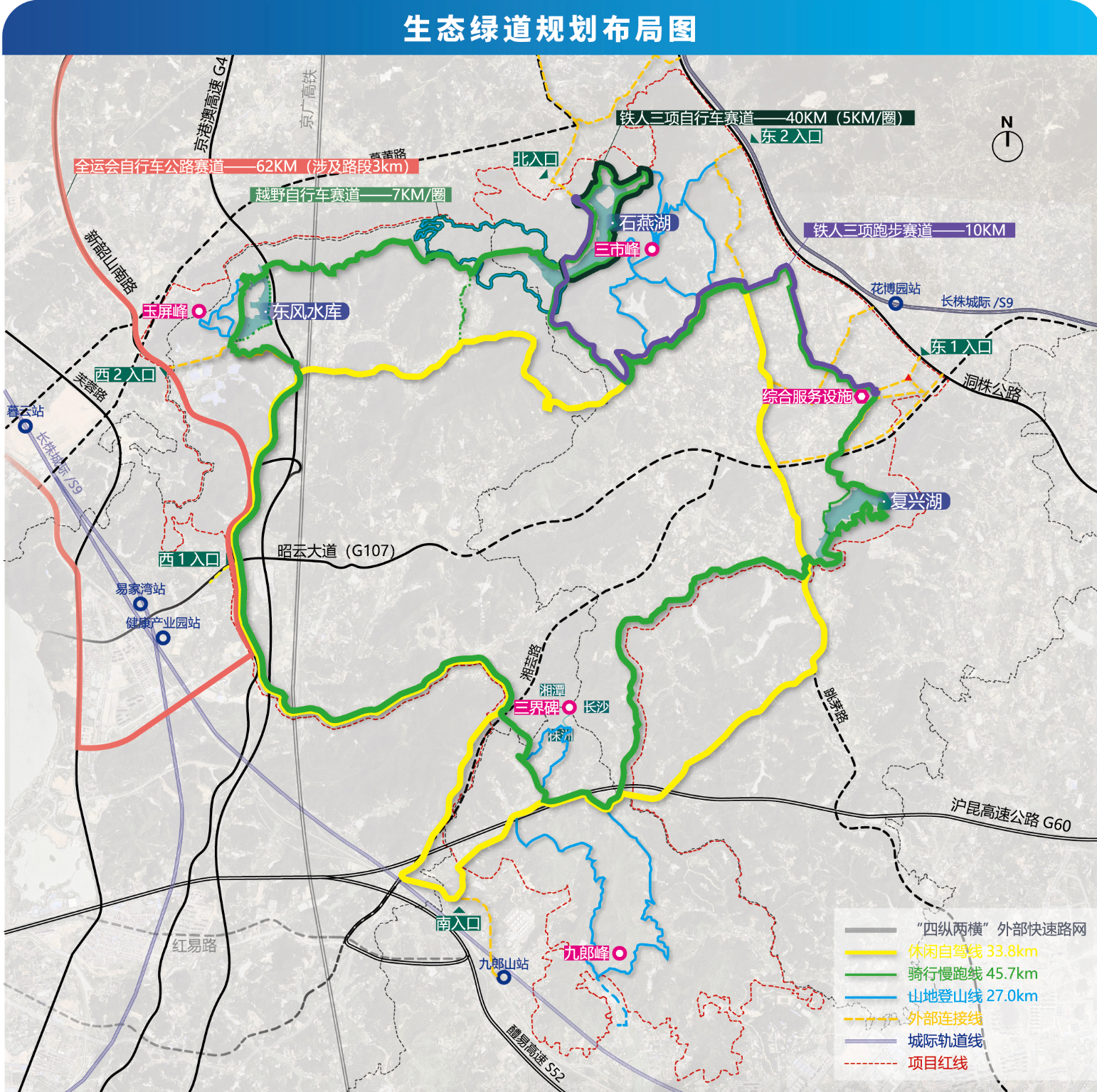 长株潭绿心生态绿道是长株潭打造“一座城”、建设“一厅一道”的重点标志性项目之一。项目为全长92.8公里的环形绿道,通过林相改造、生态修复、环境整治,设置配套服务设施,修建停车场,利用村部、民居改造设置多级驿站,串联花卉园艺博览园、石燕湖、昭山、东风水库、九郎山、三界碑、复兴湖等重点区域,打造“山地全马、百里画廊”的独特IP,建设具有影响力的都市圈风景道、健康道、致富道、幸福道。