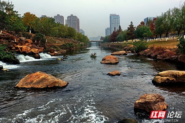 圭塘河生态公园,是长沙城里浸着暖意的角落。河水漱过赭色顽石,岸畔树色早染透斑斓,红枫烧得热烈,银杏铺成软黄,垂柳仍挽着浅绿,连道旁的枝叶都浸着胭脂色。