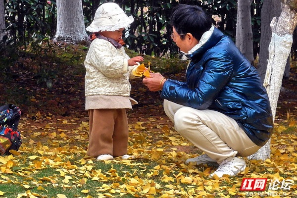 开阔草坪上,人影裹着阳光玩闹着,木栈道沿着清波蜿蜒,孩童蹲在落英里捡叶,将掌心的金黄递向俯身的长辈。